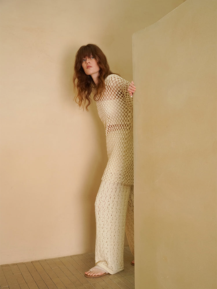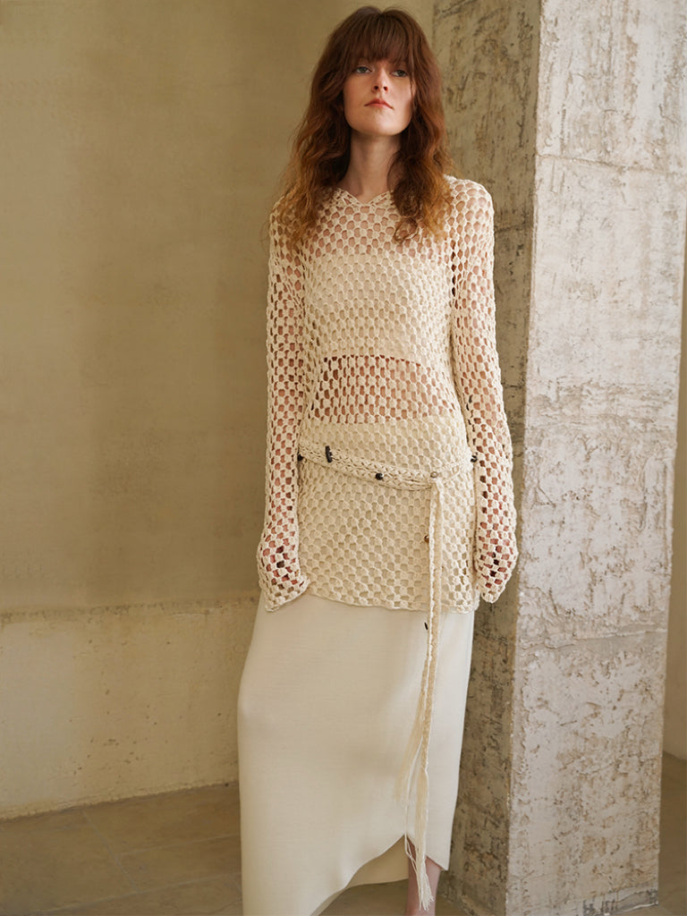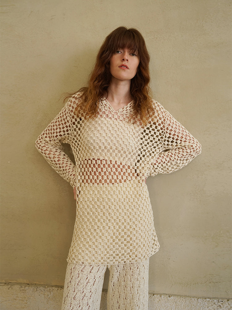 2. The garment is hand-crocheted, presenting a unique textural layering。