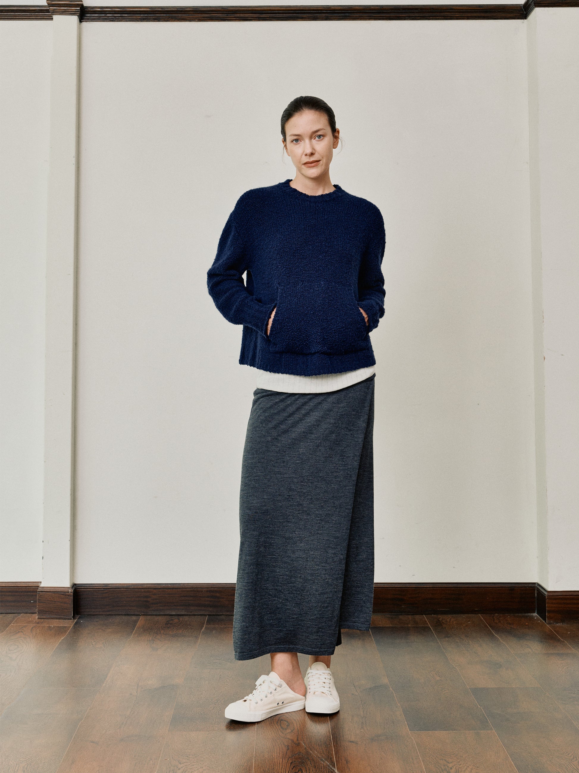 Crew-neck sweatshirt with pocketed design, balancing casual and chic.