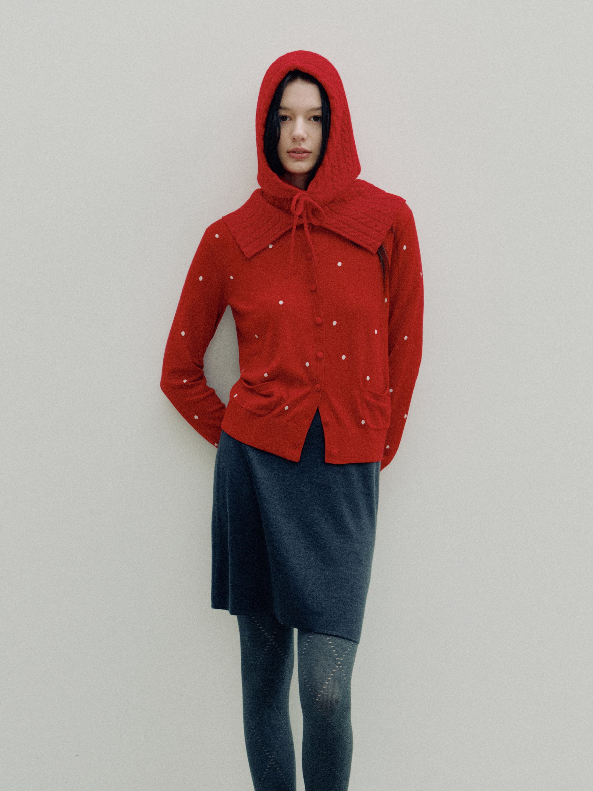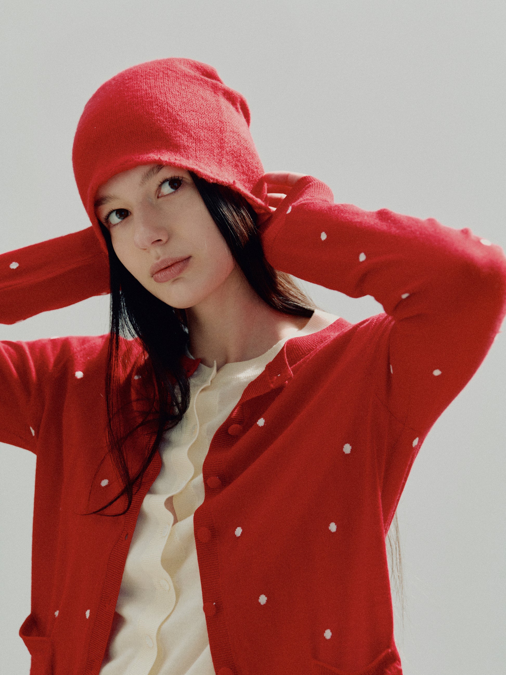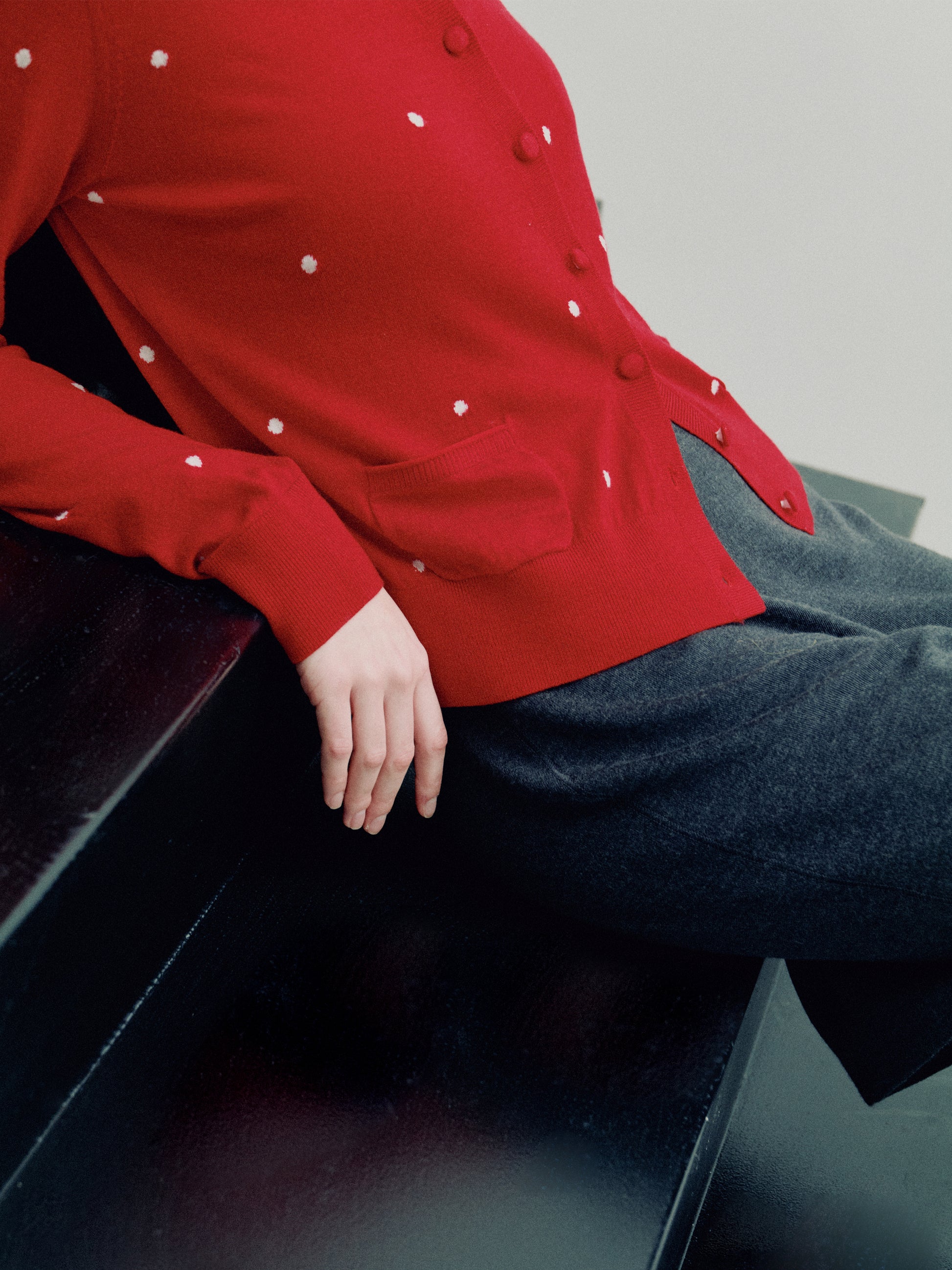 Refined round neck, effortless ease.Scattered polka dots for quiet depth.Superfine merino: light, soft, year-round climate control.